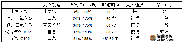 綜合以上參數,可以發現七氟丙烷在滅火效能相較其他系統出色,應用于配電室、機房等場所時,能在很短時間內將初始火情撲滅。
