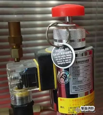 在管網(wǎng)氣體滅火系統(tǒng)的啟動瓶上,又或在預(yù)制氣體滅火系統(tǒng)(柜式、電磁型懸掛式)的滅火劑瓶組上,一般都有一個電磁閥。電磁閥下部有一個保險銷在系統(tǒng)式運行前都能夠解除的,因為它的作就是確保系統(tǒng)正式運行之前不會被啟動。
