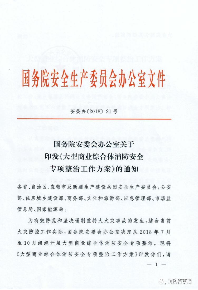 近年來,我國大型商業綜合體逐年增多。這類場所一旦發生火災,損失大、傷亡大、影響大,滅火救援困難。為切實加強火災防控工作,充分保障人民群眾生命財產安全,國務院安委會辦公室決定在全國范圍內組織開展大型商業綜合體消防安全專項整治。特制定工作方案如下: