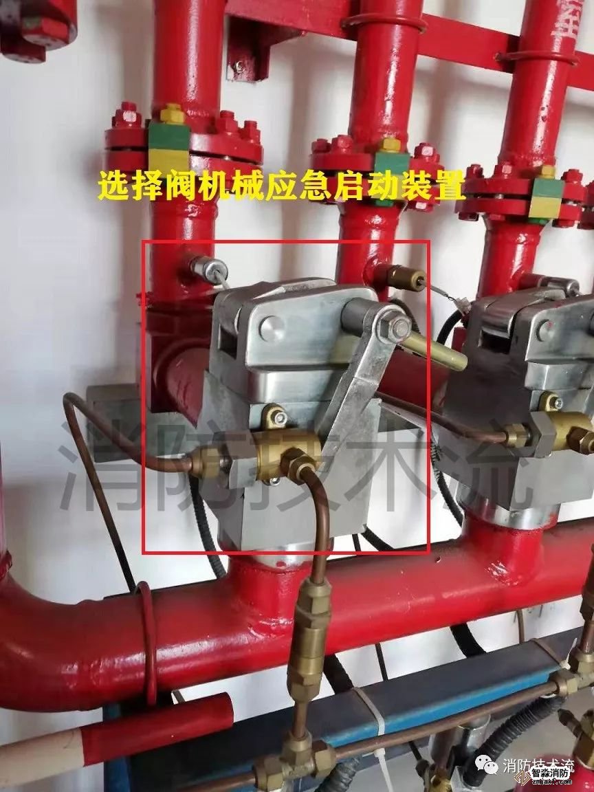 圖六:驅動氣瓶上的電磁閥,由電信號控制開啟,電動啟動失敗時也可通過拔掉保險銷手動按下應急啟動(每個驅動氣瓶對應一個氣體防護區,按下可啟動對應防護區的選擇閥及滅火劑儲氣瓶釋放氣體滅火)