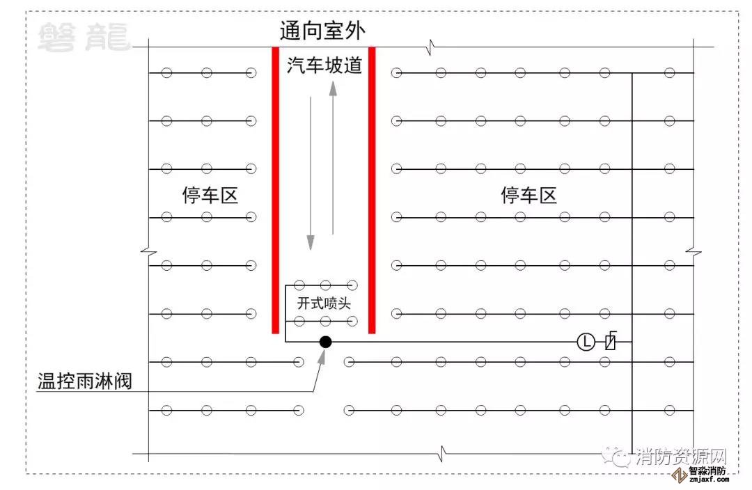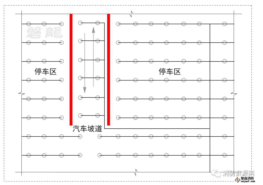 一、對于需要設置自動滅火系統保護的錯層式和斜樓板式汽車庫,由于防火分區較難分隔,停車區與車道之間也難分隔,車道、坡道上方均應設置灑水噴頭保護。