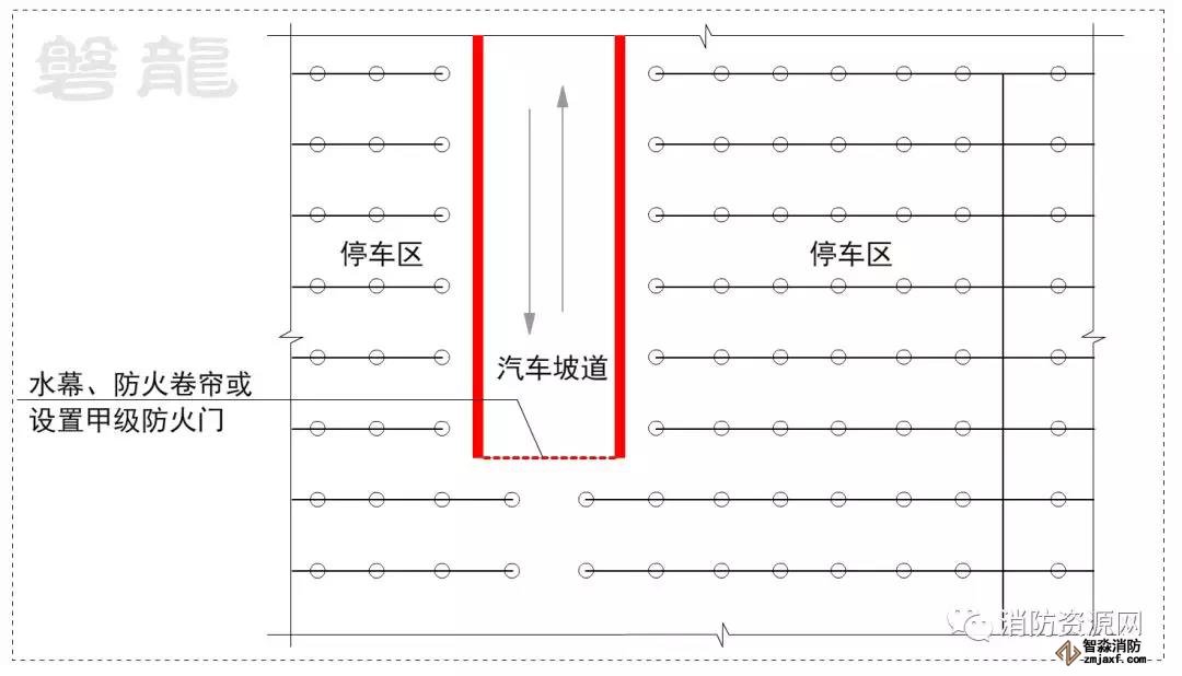 3、綜上,對于設置有自動滅火系統的汽車庫,通常會在坡道上方設置自動滅火系統保護,不需要采取防火卷簾或防火門等分隔措施。對于沒有設置自動滅火系統的汽車庫,通常會采取防火卷簾、甲級防火門等作為防火分隔措施。