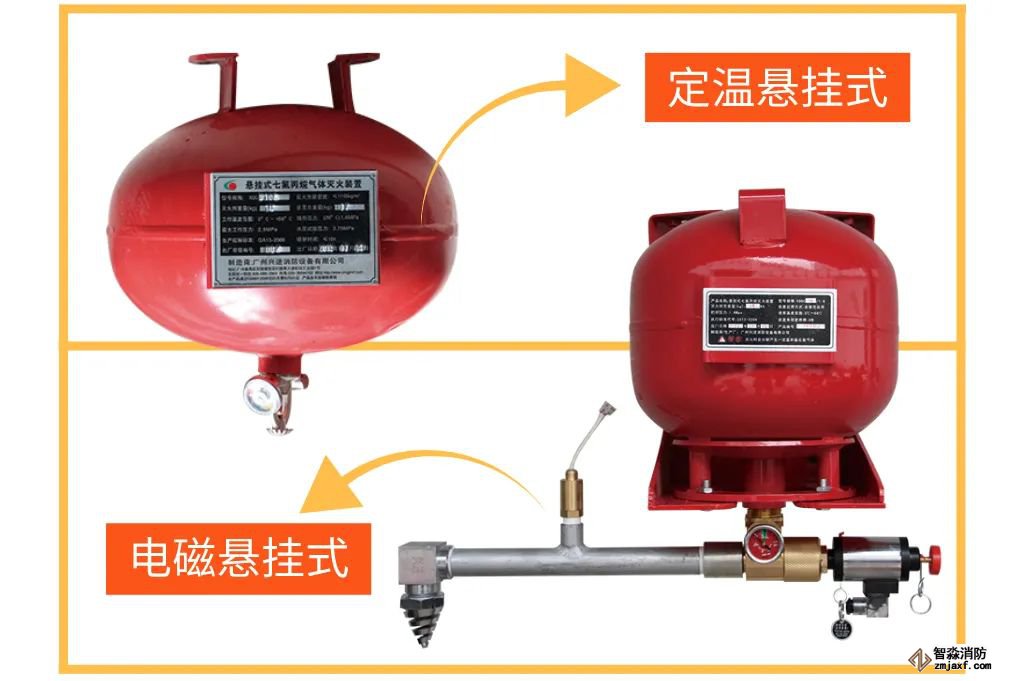 懸掛式七氟丙烷自動滅火裝置是無管網(wǎng)氣體滅火裝置(也稱預(yù)制滅火系統(tǒng))的一種,是按一定的應(yīng)用條件,將滅火劑儲存裝置和噴放組件等預(yù)先設(shè)計(jì)、組裝成套且具有聯(lián)動控制功能的滅火系統(tǒng)。懸掛式七氟丙烷自動滅火裝置又分為電磁懸掛式和定溫懸掛式兩種,電磁式由滅火劑儲存罐體、電磁驅(qū)動部件、噴頭、壓力顯示部件、信號反饋部件組成;定溫式由滅火劑儲存罐體和感溫帶表噴頭組成。