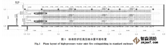 高壓細(xì)水霧泵組、穩(wěn)壓泵、增壓泵、消防水箱設(shè)置在地下室泵房?jī)?nèi),通過(guò)管道連接防護(hù)區(qū)外設(shè)置的區(qū)域控制閥箱,由閥箱控制噴頭的開(kāi)啟。書(shū)庫(kù)噴頭間距不大于2.5 m,相鄰保護(hù)區(qū)設(shè)置加密?chē)婎^,間距宜為1.25~1.50 m。標(biāo)準(zhǔn)防護(hù)區(qū)高壓細(xì)水霧平面及系統(tǒng)示意分別見(jiàn)圖1和圖2。