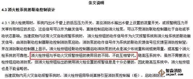 至于手報和消火栓按鈕能不能互相替代的問題,答案是明確的,消火栓按鈕與手動火災報警按鈕的使用目的不同,不能互相替代。在GB50116-2013《火災自動報警系統設計規范》4.3消火栓系統的聯動控制設計的條目說明中有原文“消火栓按鈕與手動火災報警按鈕的使用目的不同,不能互相替代。”,如下圖。