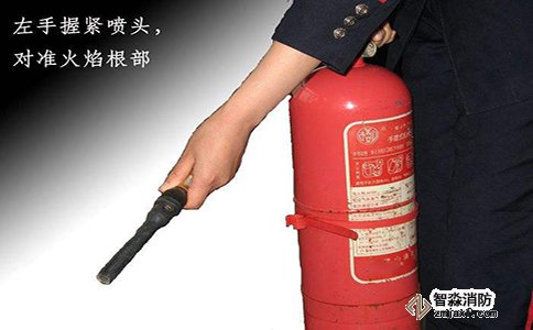 3、左手握著滅火器噴管、右手提著滅火器壓把;