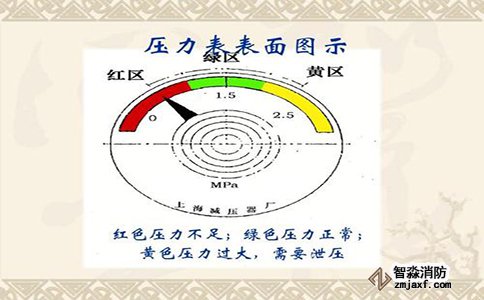 紅色區域:表示滅火器內干粉壓力較小,有無法噴出的可能或已經失效。