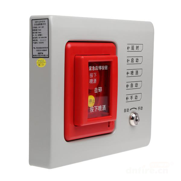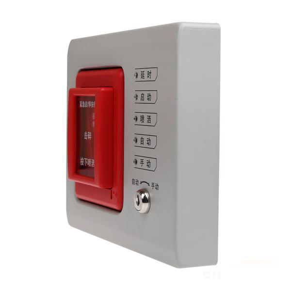 當被保護的區域內發生火災時,按下“按下噴灑”按鍵,即可向氣體滅火控制器發出氣體噴灑請求信號,氣體滅火控制器按預設邏輯開始啟動聲光報警、關閉空調風閥等,經延時后,啟動氣體噴灑電磁閥。在延時期間,若現場人員確認無火災發生或現場有人沒有撤離,可立即按下“停止”按鍵,中止延時。轉換開關為編碼方式,占一個編碼點;轉換開關同時具有系統模式轉換功能和緊急啟、停功能。