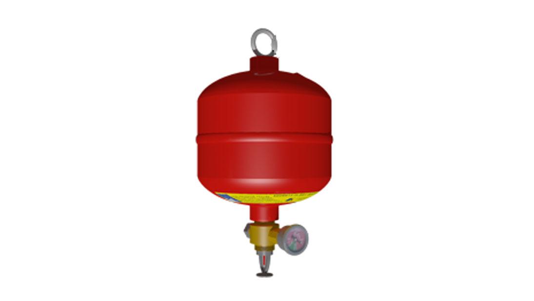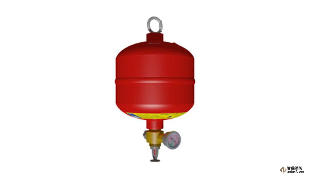 懸掛式七氟丙烷滅火裝置(溫控型)是七氟丙烷作為滅火劑,將滅火劑儲存罐體、快速響應玻璃泡噴頭、壓力顯示部件等組件預先裝配成獨立的、可懸掛安裝(或固定于墻壁上)的、火災溫度達到預設定溫時(一般為68℃)可自動啟動噴放滅火劑的一類滅火裝置。
